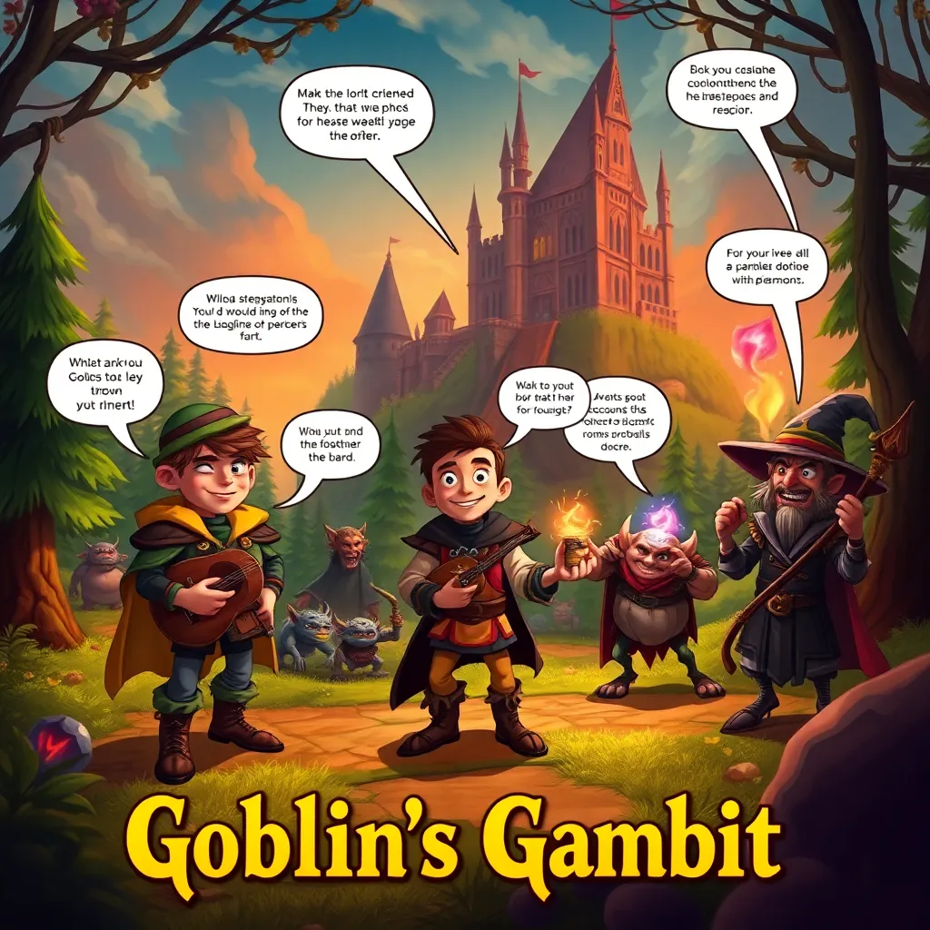 In 'Goblin's Gambit', players take on the roles of three unlikely heroes—Elliot, a bumbling bard with a penchant for bad jokes; Dylan, a meticulous alchemist obsessed with finding the right potion; and Lucious, a rogue magician who can barely control his spells. Together, they must infiltrate the kingdom ruled by the sinister Lord Grimgor and his horde of goblins. This interactive text-based game combines witty dialogue, challenging puzzles, and unexpected plot twists, as players navigate treacherous terrains, uncover secrets, and forge alliances with quirky inhabitants. Decisions matter—will they liberate the kingdom or become goblin snacks?