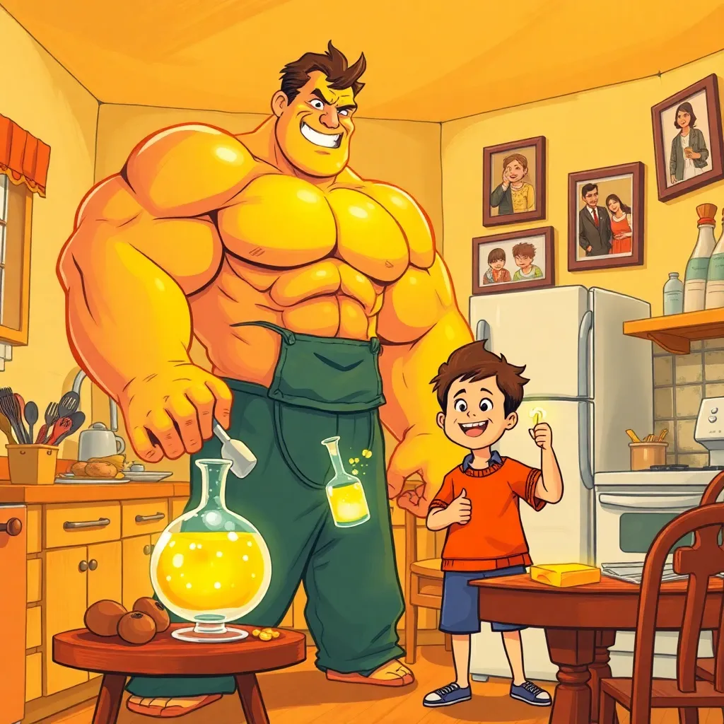 In 'Mighty Mischief,' you play as YEXPZN, a colossal bodybuilder and loving father, who's led a mostly normal life despite your impressive physique. Your son, however, has other plans. He's invented a mysterious muscle growth serum that he secretly mixes into your meals, causing you to tower over everything and everyone, growing unbearably larger and stronger each day! Dive into this interactive text-based adventure where you navigate the challenges of fatherhood, comedic situations stemming from your outrageous transformations, and the potential consequences of your son's well-intentioned meddling. Will you embrace your newfound power or confront the comedic chaos it brings to your family life?