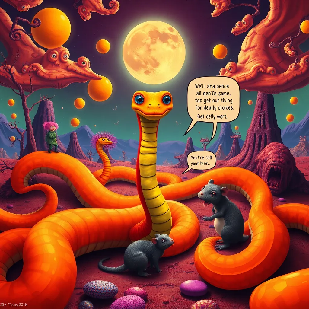 In 'Slithering Dilemma', you assume the role of Serpentine, a self-aware, witty snake who is stuck in an endless game of snakes where survival is not an option. Navigate through a surreal world filled with quirky characters, bizarre challenges, and darkly humorous situations. As you make choices that affect your journey, you'll encounter other competitive snakes, cryptic wisdom from a talking but dubious rodent, and absurd life-or-death scenarios. The twist? No matter what choices you make, Serpentine will always find a way to meet an ironic and comical end, teaching lessons on futility and absurdity. With branching paths leading to unexpected and humorous conclusions, the game explores themes of inevitability and the absurdity of existential struggle in a way that will keep players laughing, despite knowing they can never truly win.